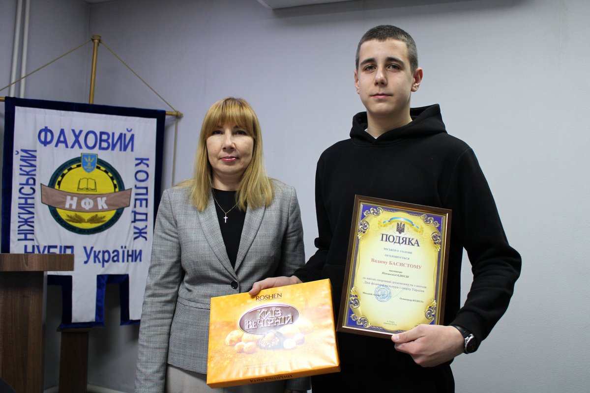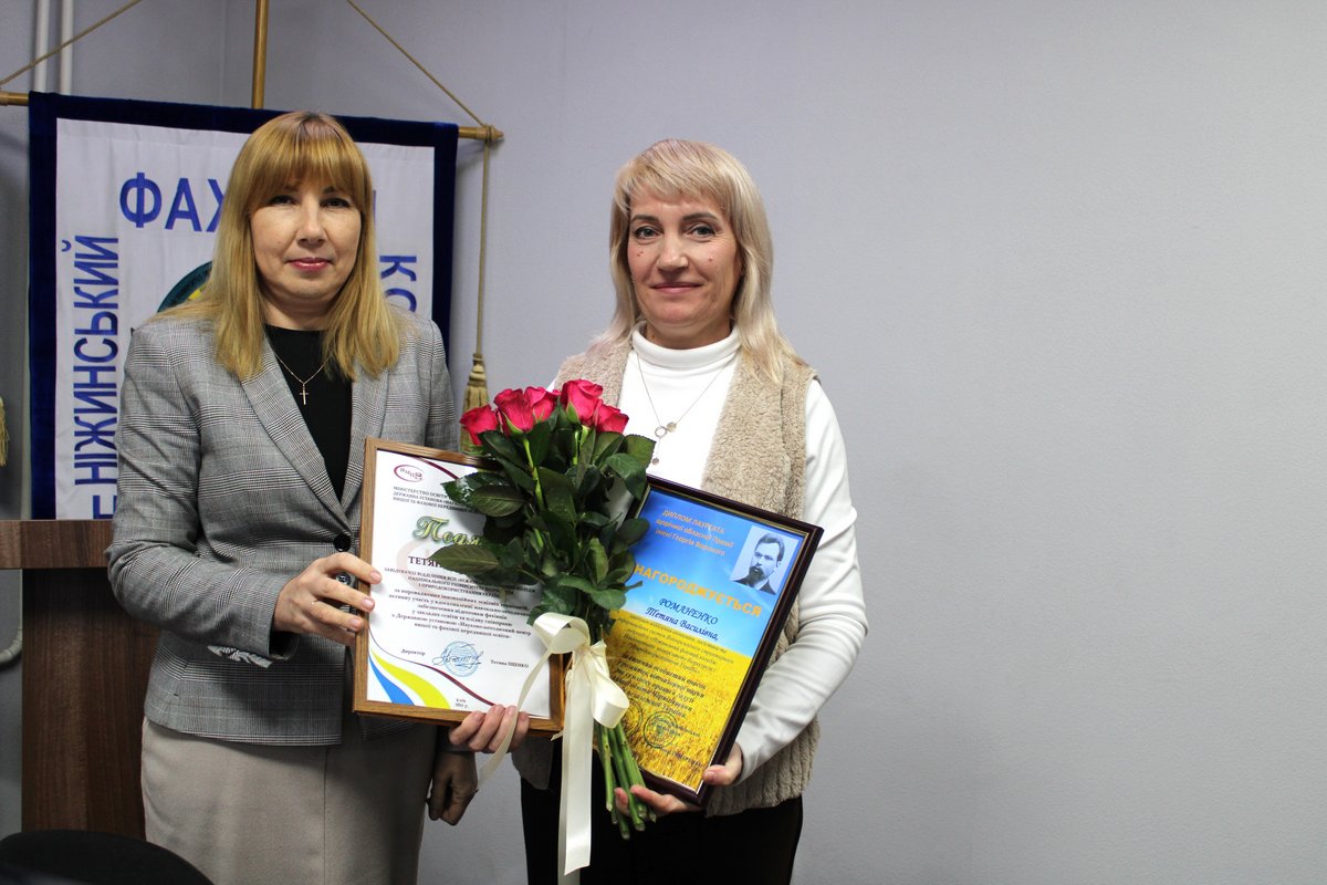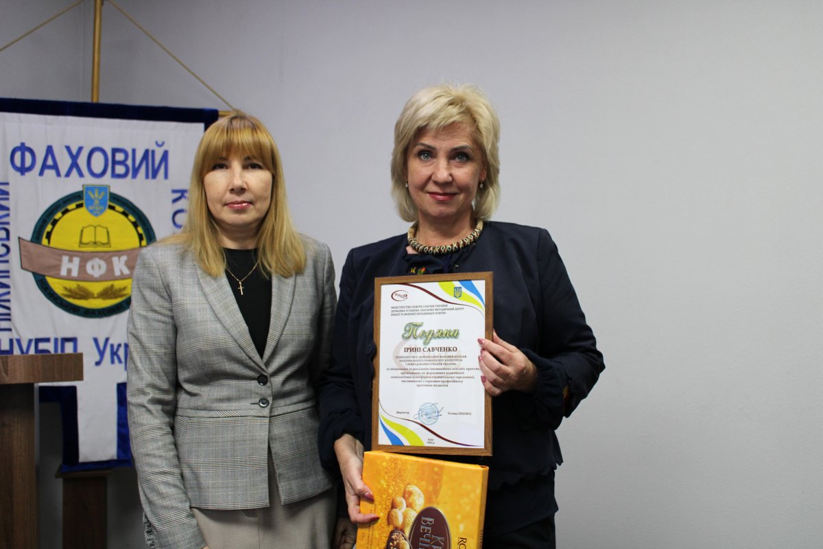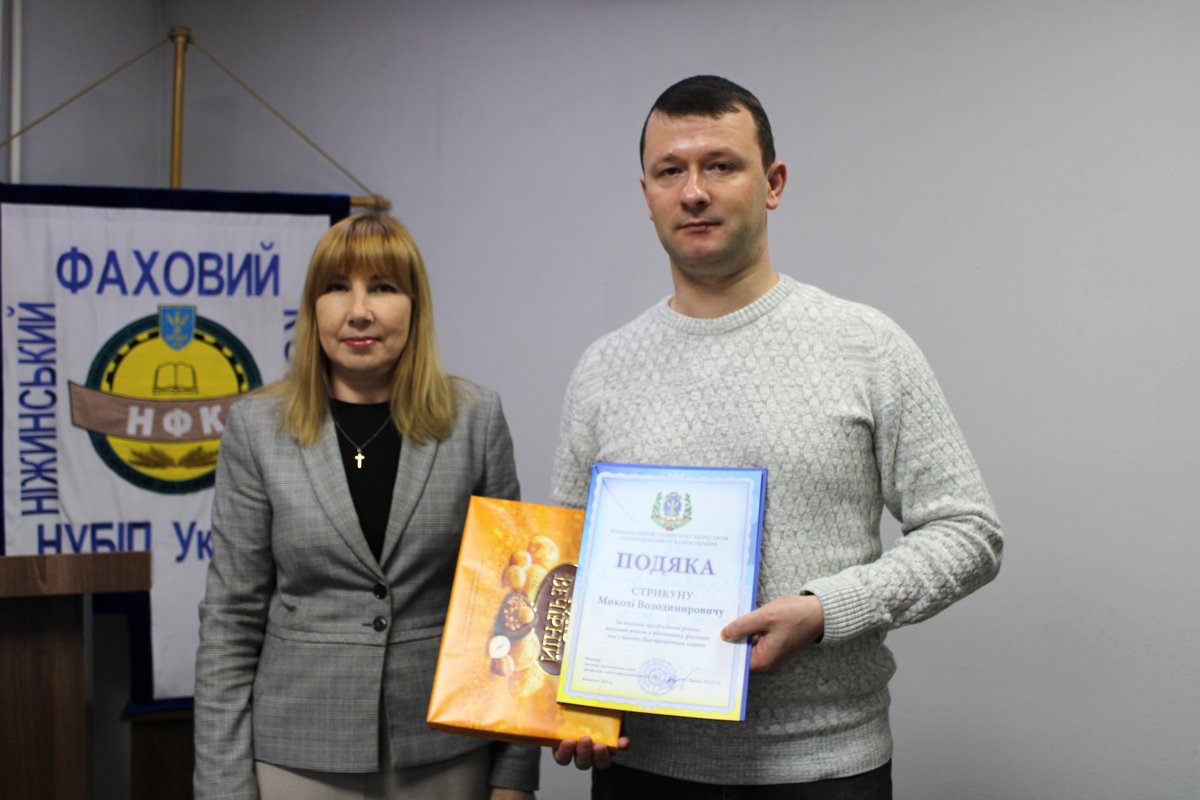 Надалі Олена Володимирівна вручила заслужені відзнаки працівникам та студентам коледжу: Тетяні Романенко, завідувачці відділення економіки, логістики та інформаційних систем – диплом лауреата премії імені Георгія Вороного та подяку Науково-методичного центру вищої та фахової передвищої освіти; Ірині Савченко, практичному психологу – подяку Науково-методичного центру вищої та фахової передвищої освіти; Миколі Стрикуну, викладачу циклової комісії з фізичного виховання – подяку НУБіП України; Вадиму Басистому, студенту першого курсу спеціальності «Агроінженерія» – подяку міського голови за вагомі спортивні досягнення.