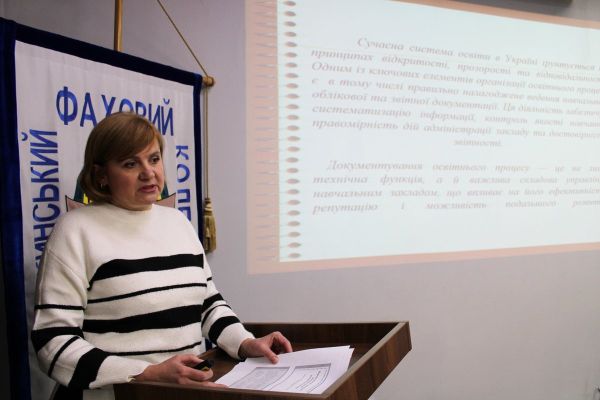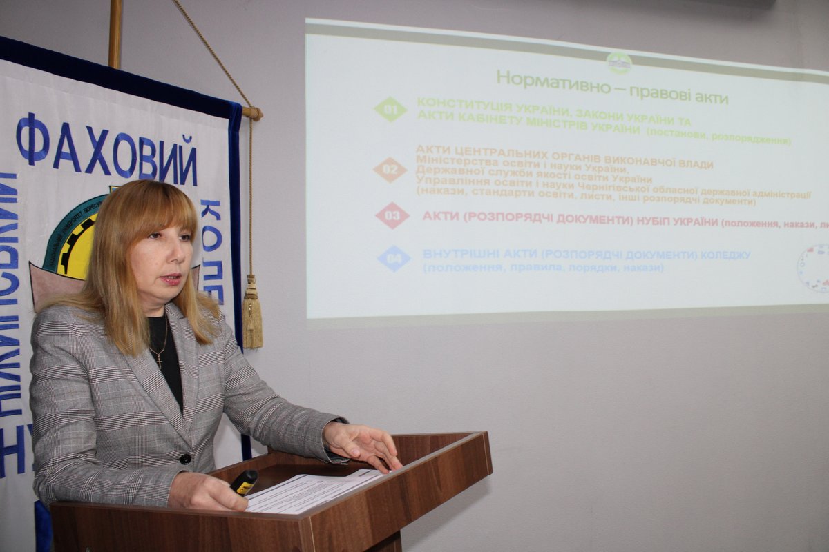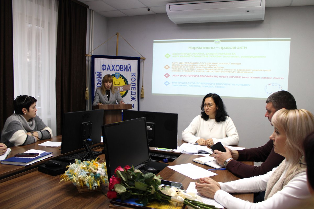 Відповідно до порядку денного першим розглядалося питання щодо вимог чинних нормативно-правових актів у сфері фахової передвищої освіти та порядку ведення навчальної, облікової і звітної документації в коледжі. Директорка коледжу Олена Литовченко та завідувачка навчально-методичного кабінету Лариса Павловська зупинилися на ієрархії нормативно-правових актів, основних принципах ведення документації, наголосивши, що дотримання вимог чинних нормативно-правових актів у діяльності закладу освіти є запорукою якісної, прозорої та ефективної роботи коледжу.