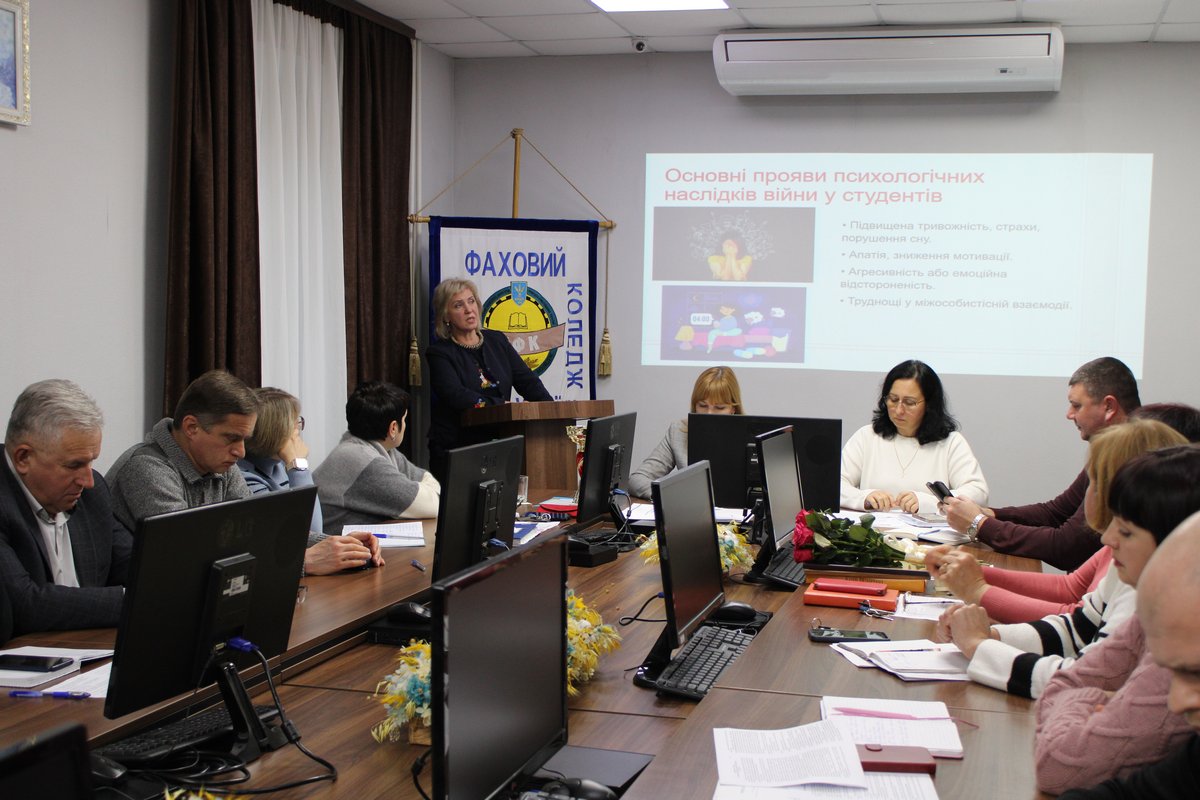 Практичний психолог коледжу Ірина Савченко, аналізуючи психологічні аспекти впливу війни на освітній процес у коледжі, порадила дбати про базові потреби, знайти способи відволіктися та контролювати інформаційний потік.
