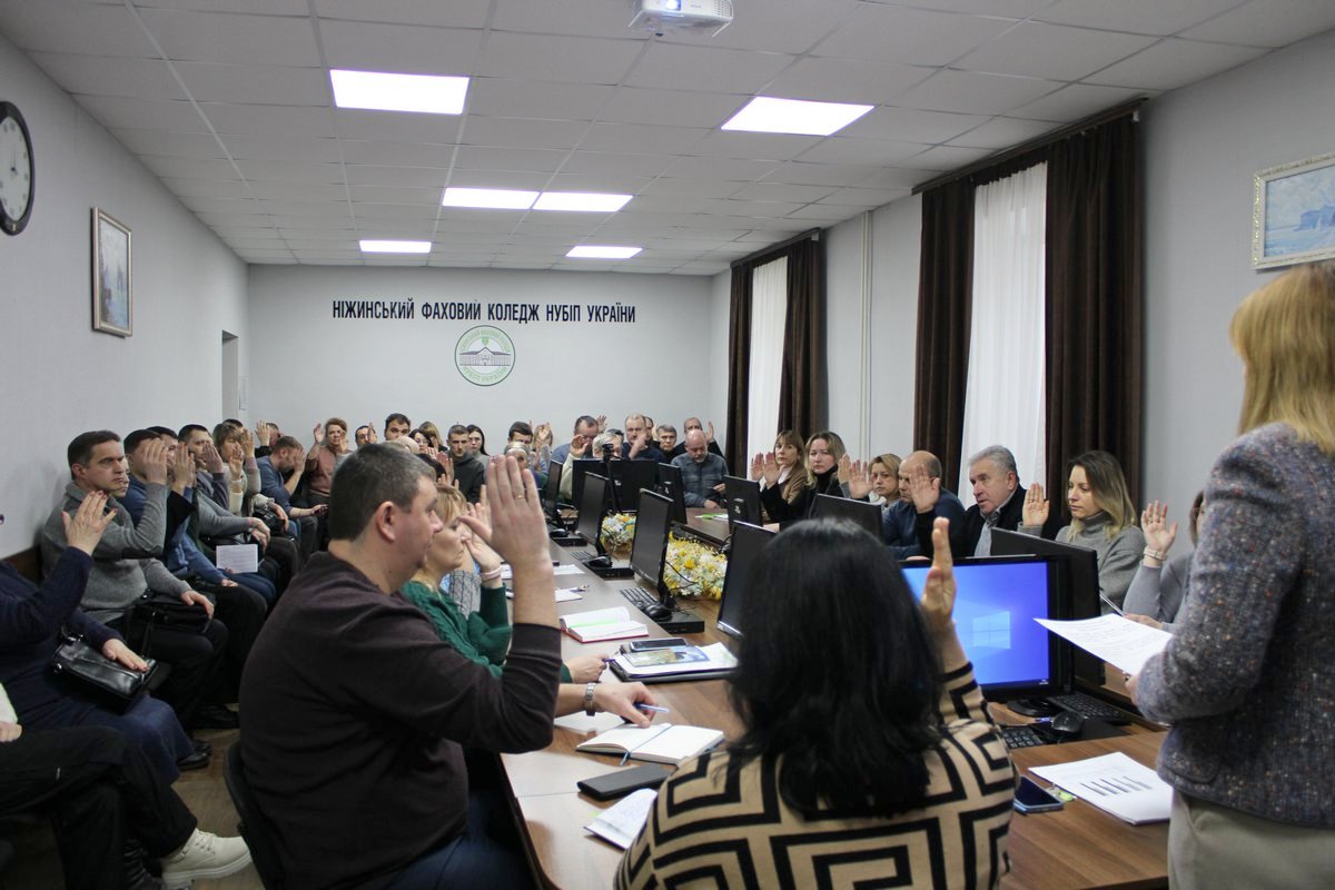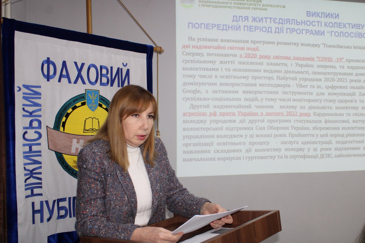 Відповідно до порядку денного директор закладу освіти Олена Литовченко представила до уваги членів Педагогічної ради Стратегію розвитку ВСП «Ніжинський фаховий коледж НУБіП України» на 2026-2030 роки «Голосіївська ініціатива – 2030» та Програму розвитку коледжу на 2026 рік, розроблені на основі Стратегії розвитку Національного університету біоресурсів і природокористування України на період 2026-2030 років «Голосіївська ініціатива – 2030» з урахуванням специфіки коледжу. Напрямами роботи на найближчі 5 років є підтримка Сил оборони добровільною благодійною допомогою; взаємодія академічної спільноти з громадами, підприємствами; забезпечення якості освіти; цифрова трансформація, штучний інтелект та рівність доступу; навчально-методична та наукова діяльність для досягнення цілей системного розвитку коледжу; міжнародна співпраця для системного розвитку та відбудови; інфраструктурна та інклюзивна техніко-технологічна стійкість коледжу; ефективне управління розвитком коледжу на основі фінансової стійкості; студентське самоврядування та організаційно-виховна робота; суспільно-соціальна відповідальність коледжу; комунікація із суспільством, впізнаваність бренду та залучення талантів.