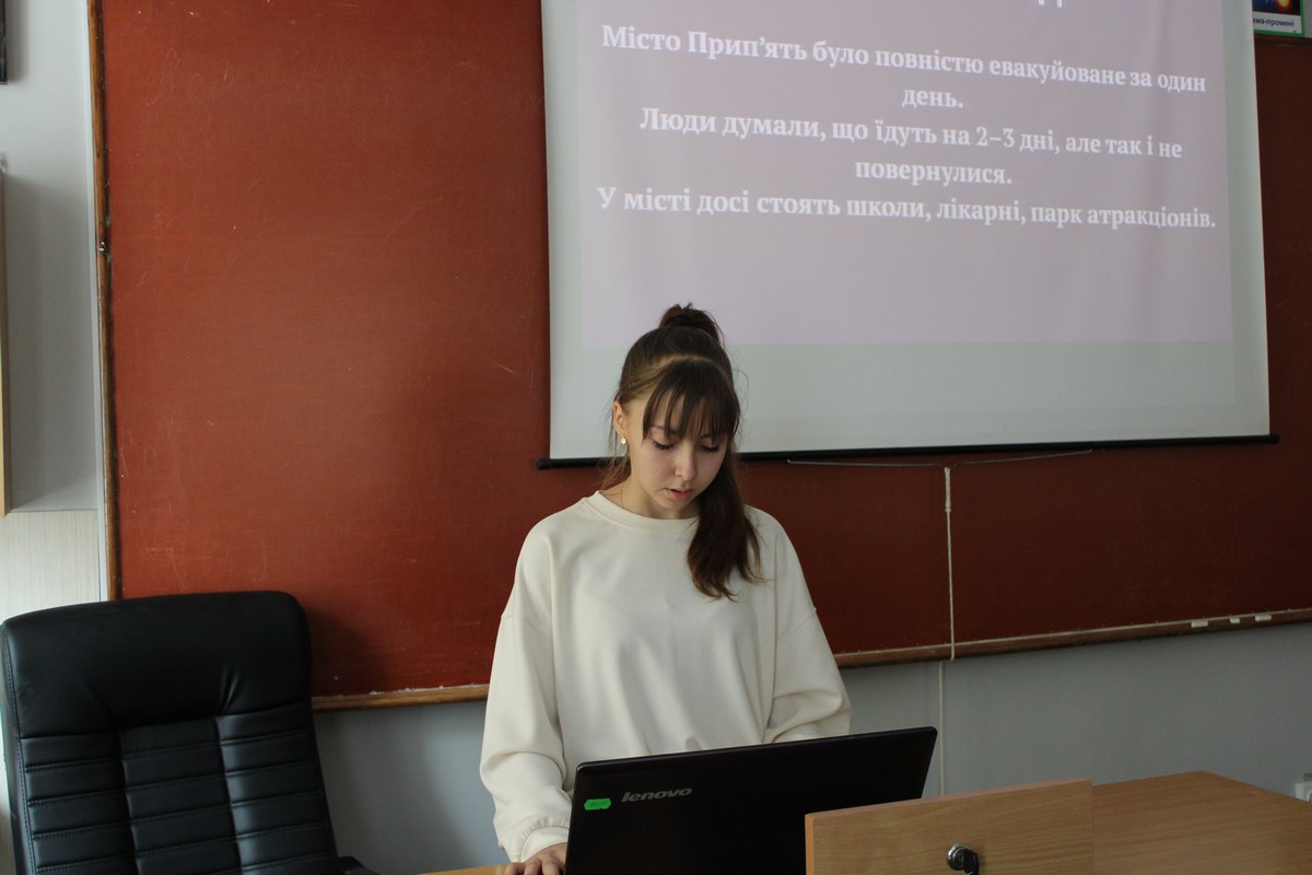 24 квітня для студентів першого курсу відділення економіки, логістики та інформаційних систем спеціальності D1 Облік і оподаткування, було проведено круглий стіл «Фізика Чорнобильської катастрофи: причини та наслідки» під керівництвом викладача фізики Марії Кулик, яка змогла поєднати наукову складову з важливим виховним змістом.