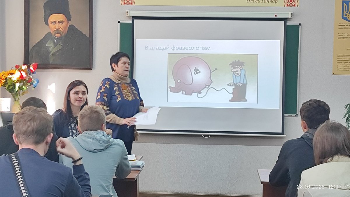 Особливим азартом відзначився конкурс «Скажи без затримки», у якому студенти наперебій називали антоніми й синоніми у швидкому темпі. Захопливим було розгадування фразеологізмів за зображеннями у конкурсі «Відгадай фразеологізм». Учасники замислилися над влучністю і дотепністю сталих виразів, їх мовним багатством.