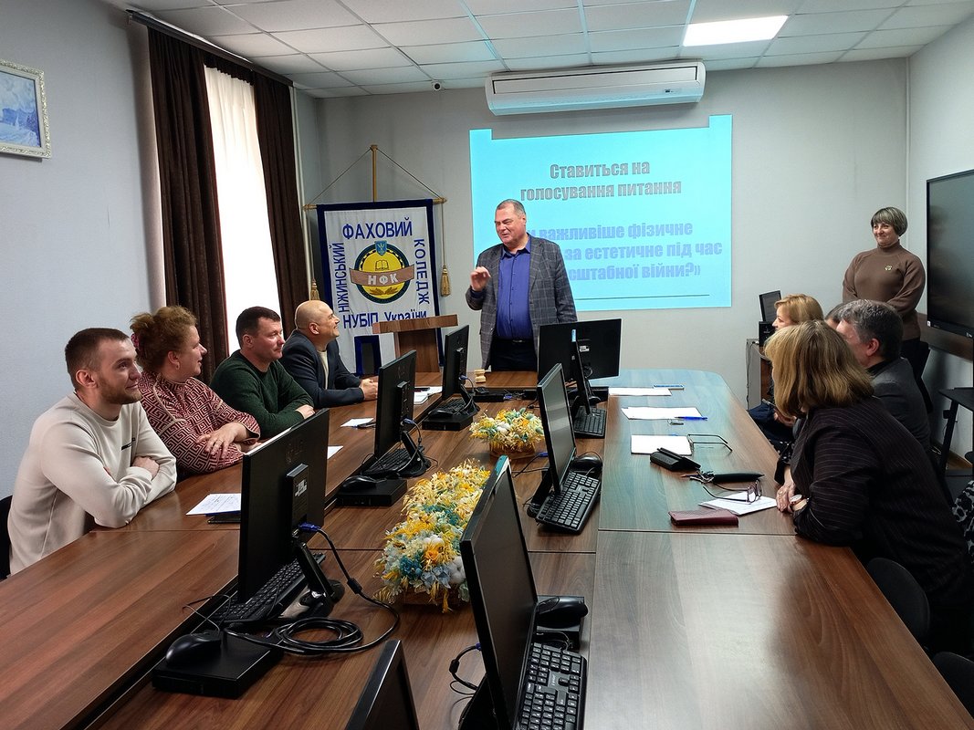 Тема дебатів: «Чи важливіше фізичне виховання за естетичне під час повномасштабної війни?» Учасники розділилися на три партії: «пропозицію», що підтримує питання, «опозицію», що опонує йому, та «центр», який ще не визначився і за голоси якого змагаються учасники. У складі «центру» – заступник директора з навчально-виховної роботи Тетяна Шеїн, завідувач відділення технічно-енергетичних систем та засобів автоматизації Олександр Ландик, методисти й викладачі коледжу. Пропозицію й опозицію представляли по чотири спікери, кожен з яких виконував свою роль. Вів засідання головуючий-чеамен, викладач-методист Микола Новіков, який за правилами не міг ні виступати, ні голосувати до закінчення дебатів, допомагав йому секретар – викладач-методист циклової комісії загальноосвітніх дисциплін Оксана Кулик. Усі учасники дебатів мали право ставити запитання кожному спікерові після його виступу; згідно з регламентом їхня кількість не повинна була перевищувати трьох.