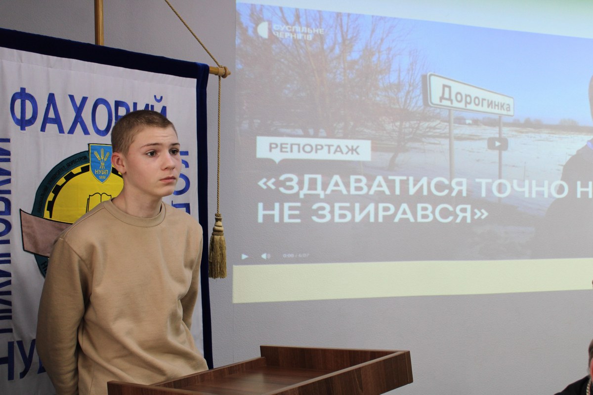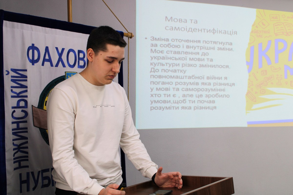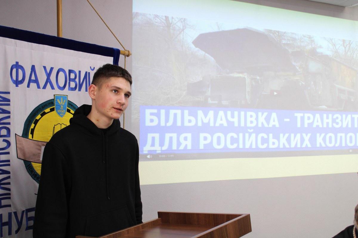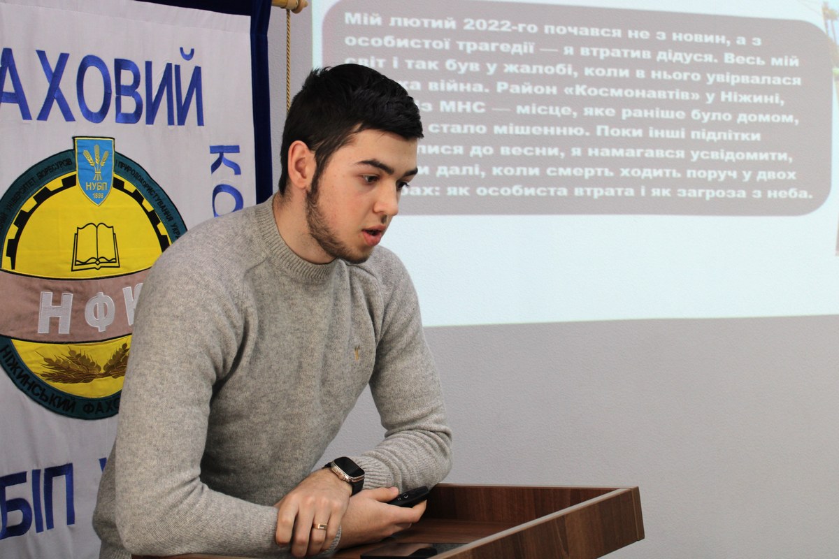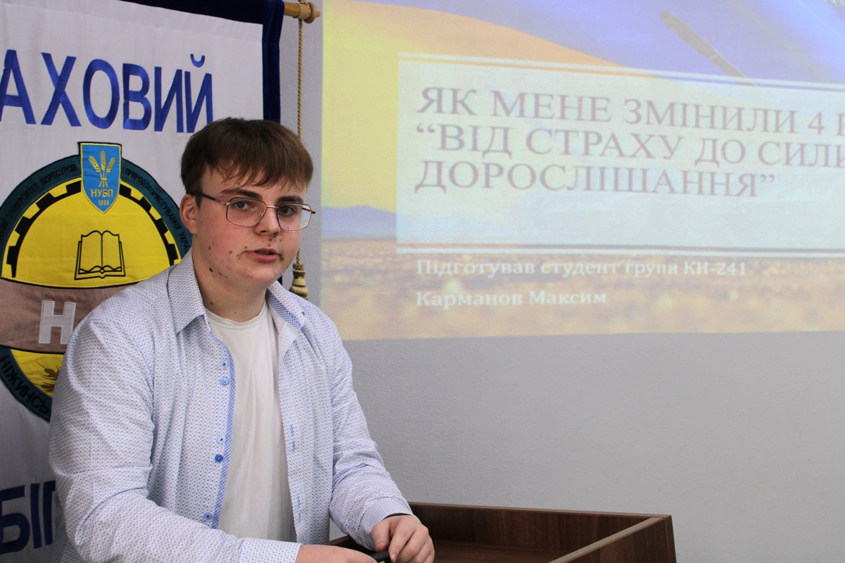 Студент Карманов Максим у виступі «Від страху до сили: мій шлях дорослішання» поділився особистим досвідом переосмислення цінностей; Пирогов Олександр у доповіді «Уроки стійкості: від пам’яті до дії» наголосив на відповідальності молоді за майбутнє держави; Туровець Владислав у спогадах «Життя в одному рюкзаку: як я подорослішав» щиро розповів про свої переживання в перші дні початку повномасштабної війни та швидке дорослішання у воєнних умовах.