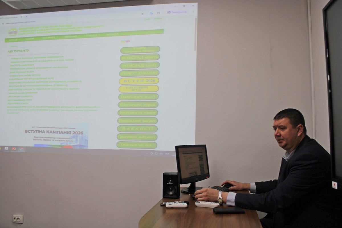 Завідувач відділення технічно-енергетичних систем та засобів автоматизації Олександр Ландик провів віртуальну екскурсію офіційним сайтом коледжу, ознайомивши присутніх із його структурою та основними розділами, детально пояснивши, де саме можна знайти актуальну інформацію про спеціальності, умови вступу, освітній процес, студентське життя та новини закладу. Акцентував увагу на зручності користування сайтом, можливостям швидкого доступу до необхідних ресурсів, а також використанню електронних сервісів для абітурієнтів і студентів. Такий формат презентації сприяв кращому орієнтуванню майбутніх вступників в інформаційному просторі коледжу та підвищив їх обізнаність щодо освітніх можливостей закладу.