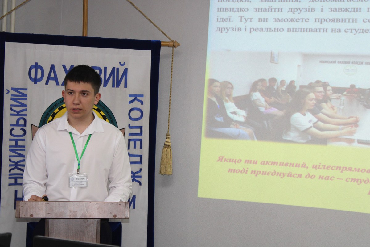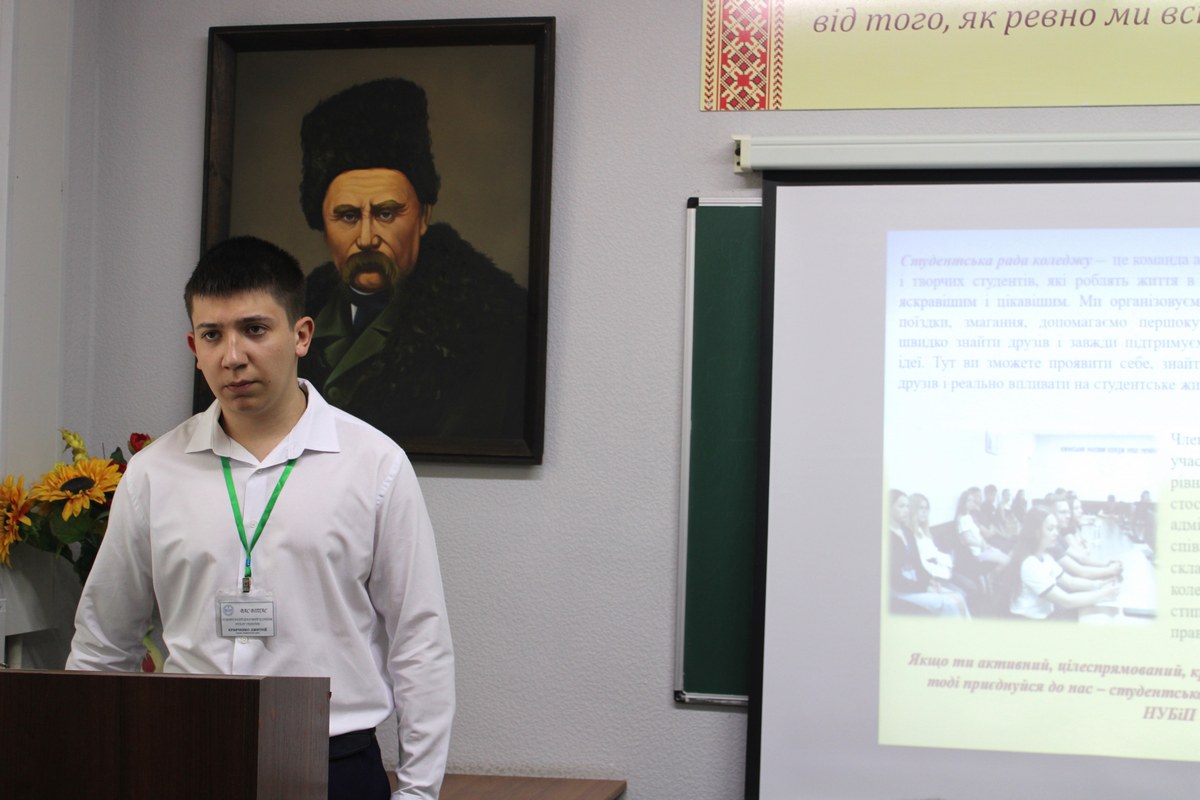 Про студентське життя в коледжі, діяльність органів студентського самоврядування та можливості змістовного дозвілля присутнім розповів голова студентської ради Дмитрій Кравченко. Він поділився власним досвідом навчання, участі в різноманітних заходах, проєктах й ініціативах, що сприяють самореалізації молоді. Окрему увагу було приділено активній участі студентів у культурному, спортивному та волонтерському житті коледжу, що створює сприятливі умови для всебічного розвитку особистості. Також запросив майбутніх вступників приєднуватися до великої та дружної коледжівської родини, яка допоможе не лише цікаво й змістовно провести роки навчання, а й реалізувати свій потенціал, набути нових знайомств і знайти своє місце в житті.
