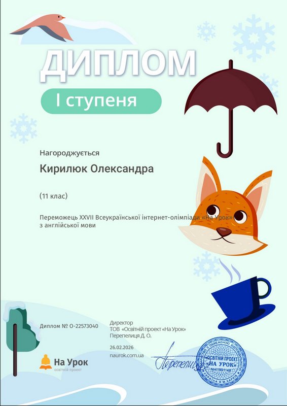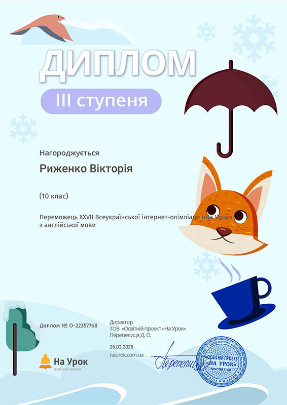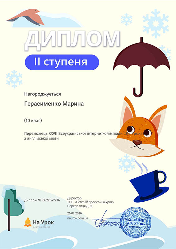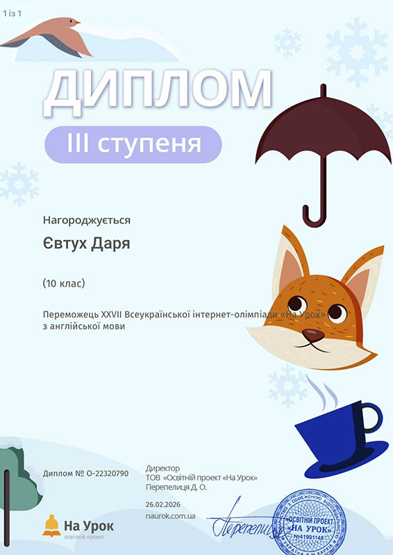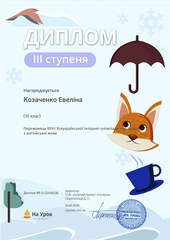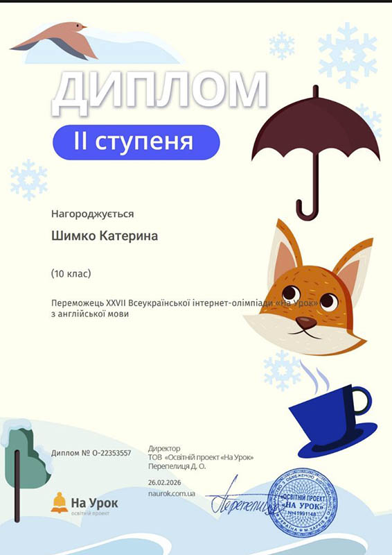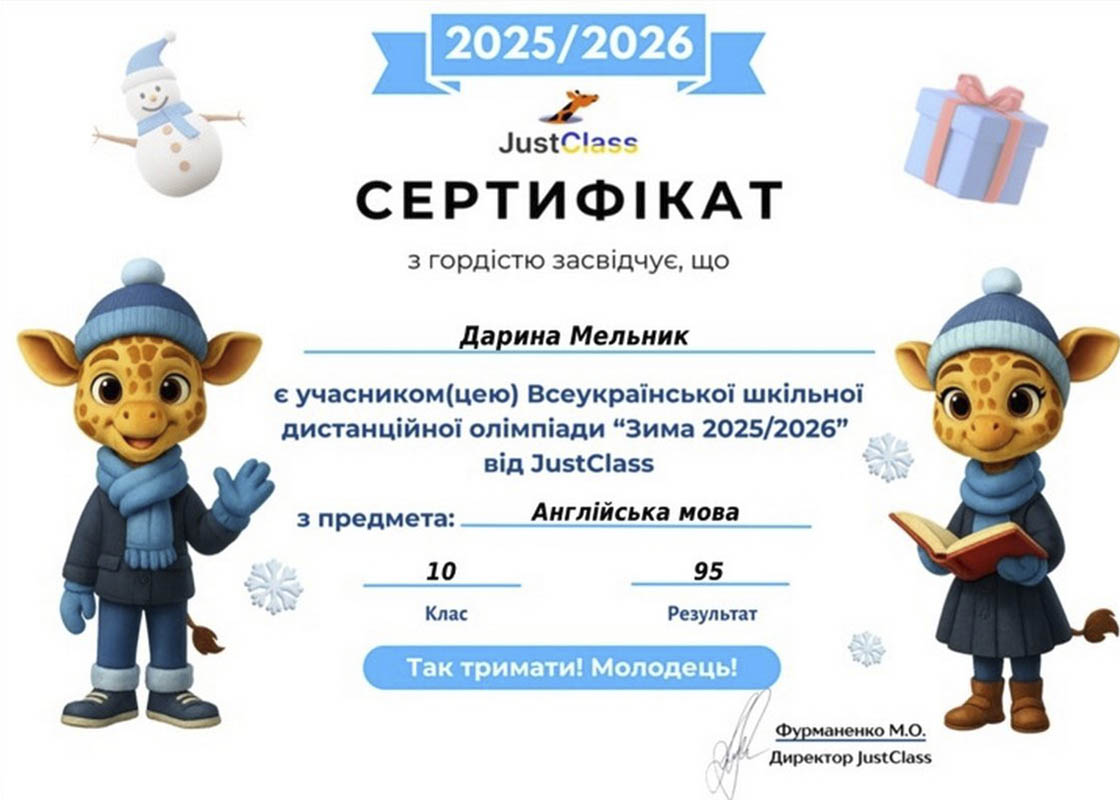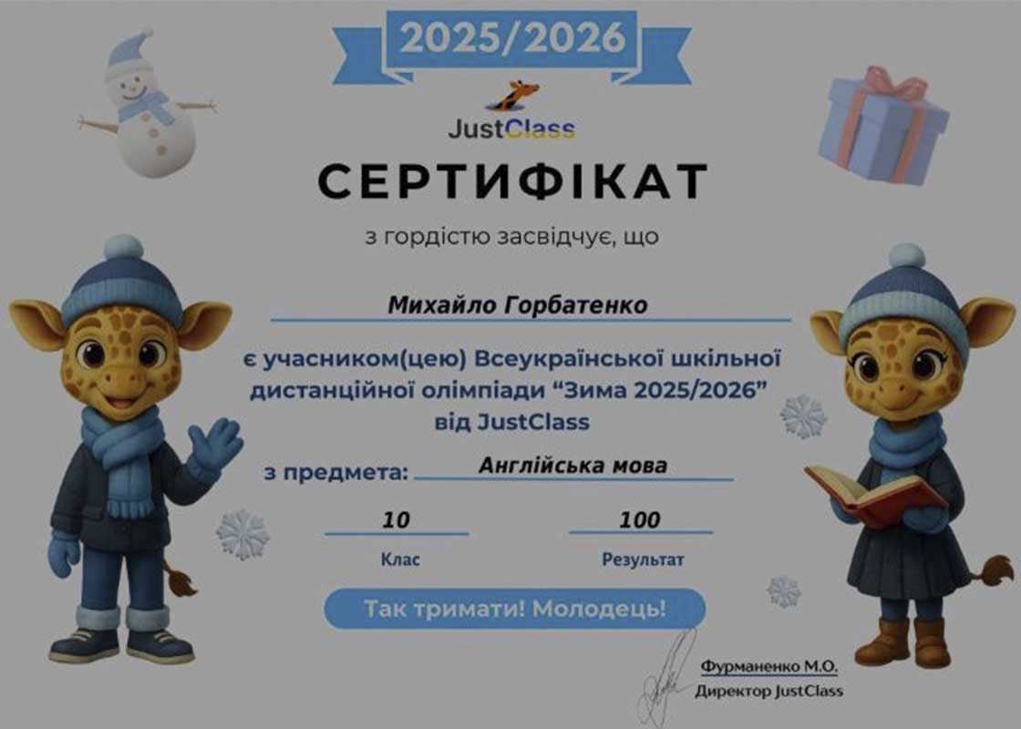 Студенти, які брали участь у Всеукраїнській шкільній дистанційній олімпіаді «Зима 2025–2026» на онлайн-платформі «JustClass» отримали сертифікати учасників: Діана Падалка, Вікторія Риженко (група ОН251), Мельник Дарина (група ПН251), Михайло Горбатенко (група КН251).