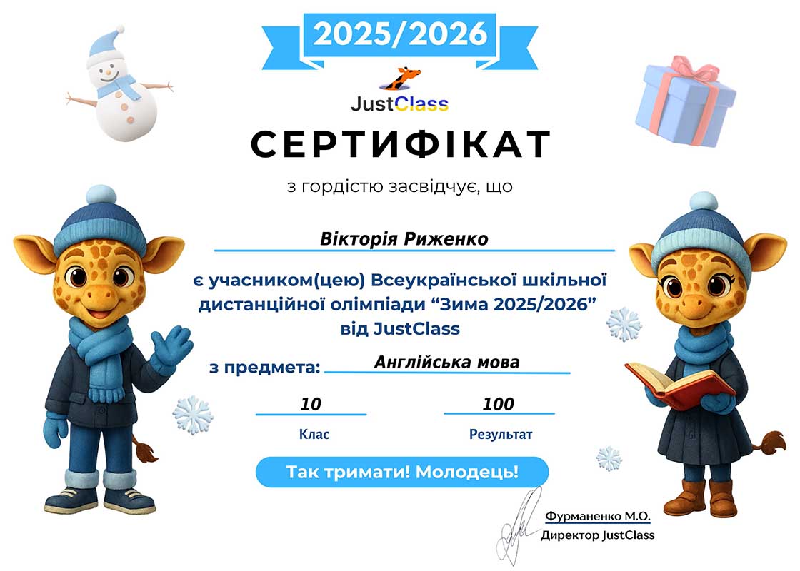 І, ІІ та ІІІ ступеня або сертифікати за участь. У свою чергу, олімпіада від платформи «JustClass» – це не просто змагання, а справжнє свято знань, мотивації та розвитку. Усі учасники без винятку отримують сертифікати, а десять учасників, які набрали 100 балів і виконали завдання найшвидше та правильно, мають можливість отримати грошові призи.