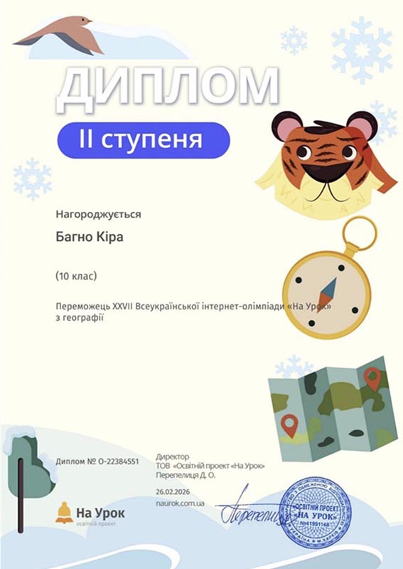 За активність, удосконалення пізнавальних навичок та інтерес до предмета «Географія» дипломами II ступеня були нагороджені студенти: Багно Кіра, Євтух Дар’я, Ковтун Іванна, Козаченко Евеліна, Падалка Діана (група ОН251), Дорошенко Влада, Мельник Дарина, Риженко Вікторія (група ПН251), Личак Михайло (група АН251).