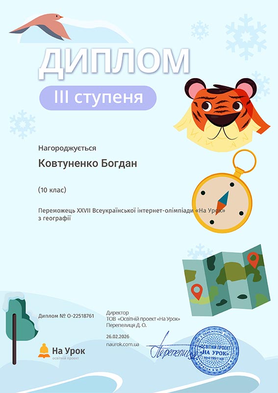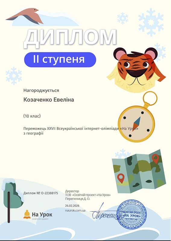 Окремо варто відзначити студентку Риженко Вікторію (група ОН251), яка також взяла участь у Всеукраїнській шкільній дистанційній олімпіаді «Зима 2025–2026» на онлайн-платформі Just Class та здобула сертифікат за І місце.