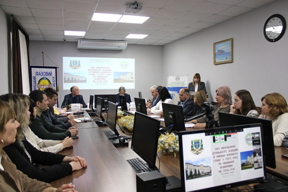 Під час виступу керівником було узагальнено результати діяльності коледжу за 2025 рік, який проходив у складних умовах воєнного стану. Проаналізовано роботу структурних підрозділів, окреслено досягнення та проблемні питання. Попри складні умови воєнного часу, колектив коледжу продемонстрував високий рівень організованості, професійності та стійкості, забезпечивши стабільність освітнього процесу й належний рівень безпеки всіх учасників освітнього середовища.