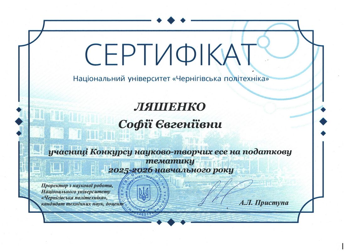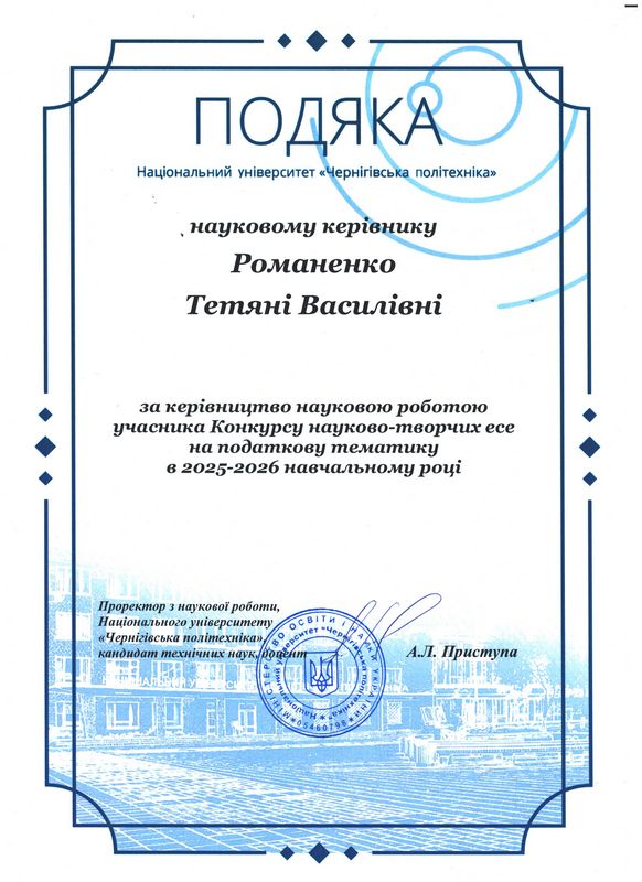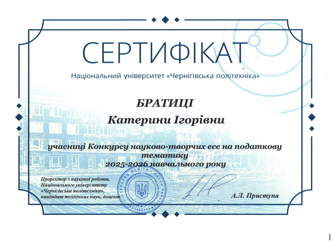 Протягом листопада-грудня 2025 року кафедрою економіки, обліку і оподаткування Національного університету «Чернігівська політехніка» за підтримки Головного управління Державної податкової служби у Чернігівській області та Управління освіти і науки Чернігівської облдержадміністрації проведено ІV Обласний конкурс науково-творчих есе на податкову тематику.