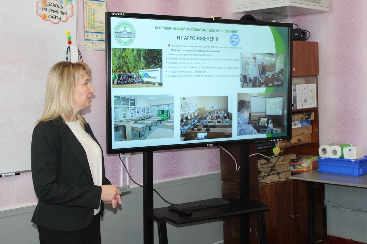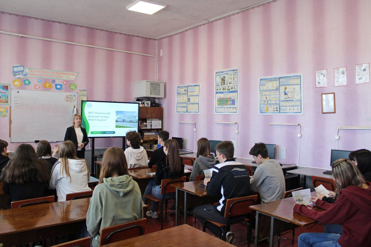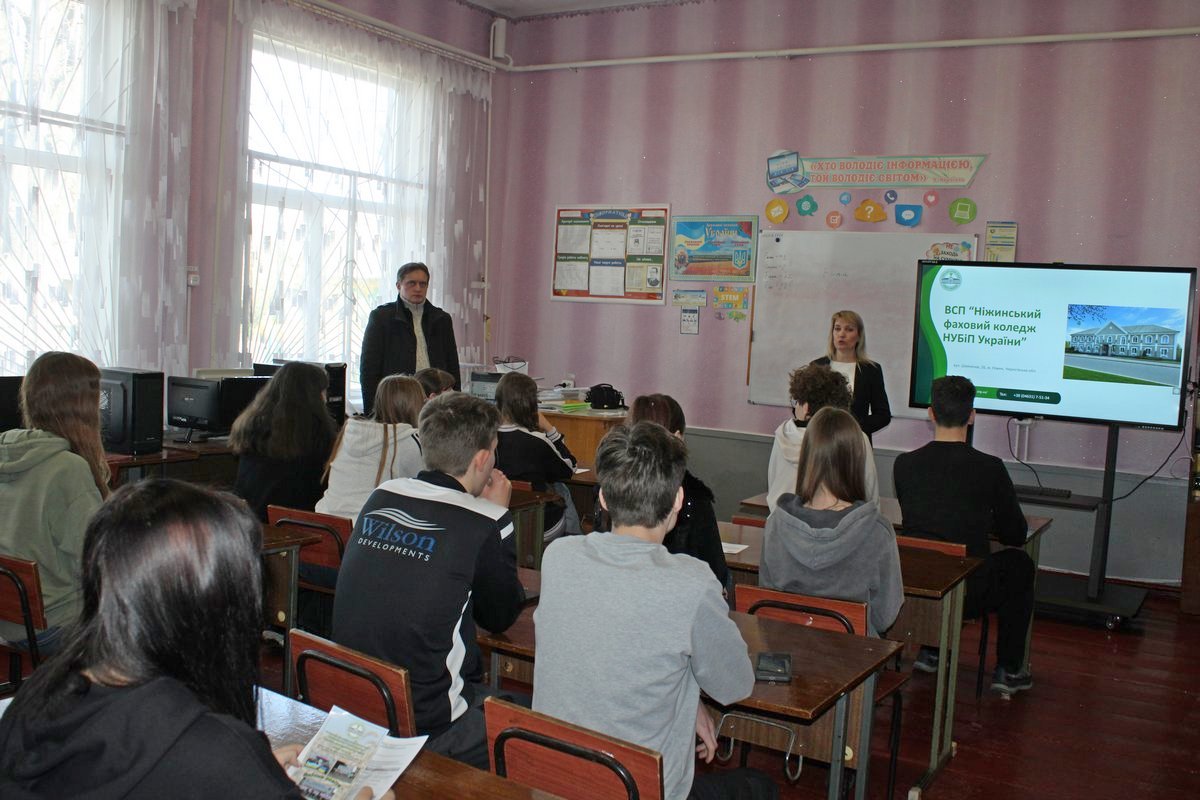 З цією метою представники ВСП «Ніжинський фаховий коледж НУБіП України» – завідувач відділення економіки, логістики та інформаційних систем Тетяна Романенко, викладач циклової комісії соціально-гуманітарних дисциплін Анатолій Щербина та провідний фахівець з профорієнтаційної роботи Валерія Литвиненко – відвідали Ніжинську гімназію № 6.