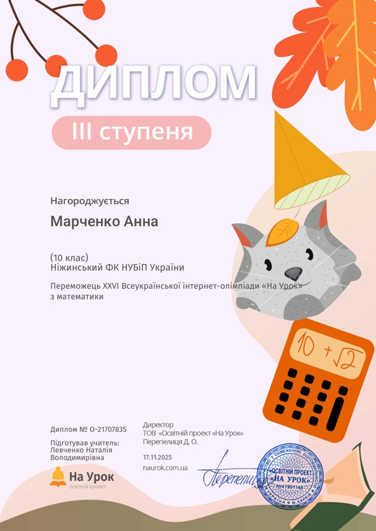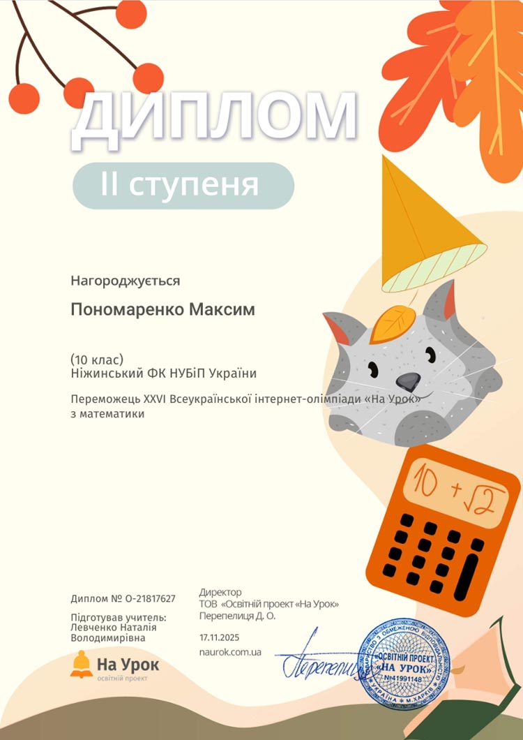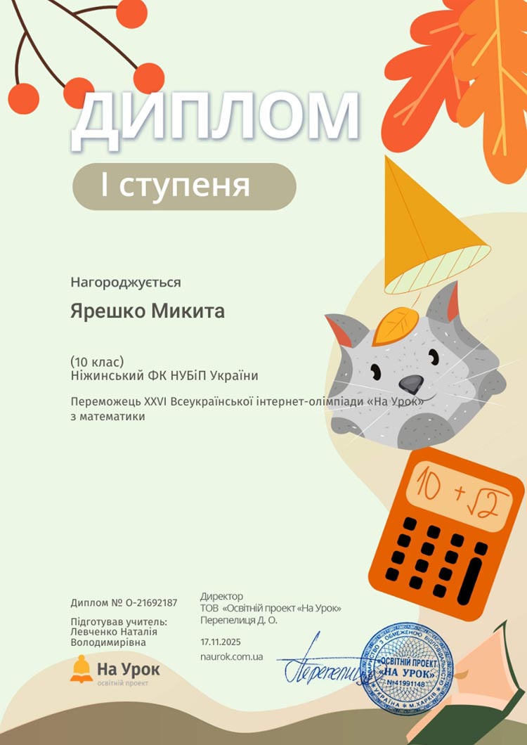 З 13 жовтня по 11 листопада на освітній платформі «На Урок» проходила XXVІ Всеукраїнська інтернет-олімпіада з математики, участь в якій взяли студенти перших курсів Ніжинського фахового коледжу НУБіП України, продемонструвавши високий рівень зацікавленості, наполегливість та впевнені знання з однієї з найскладніших навчальних дисциплін.