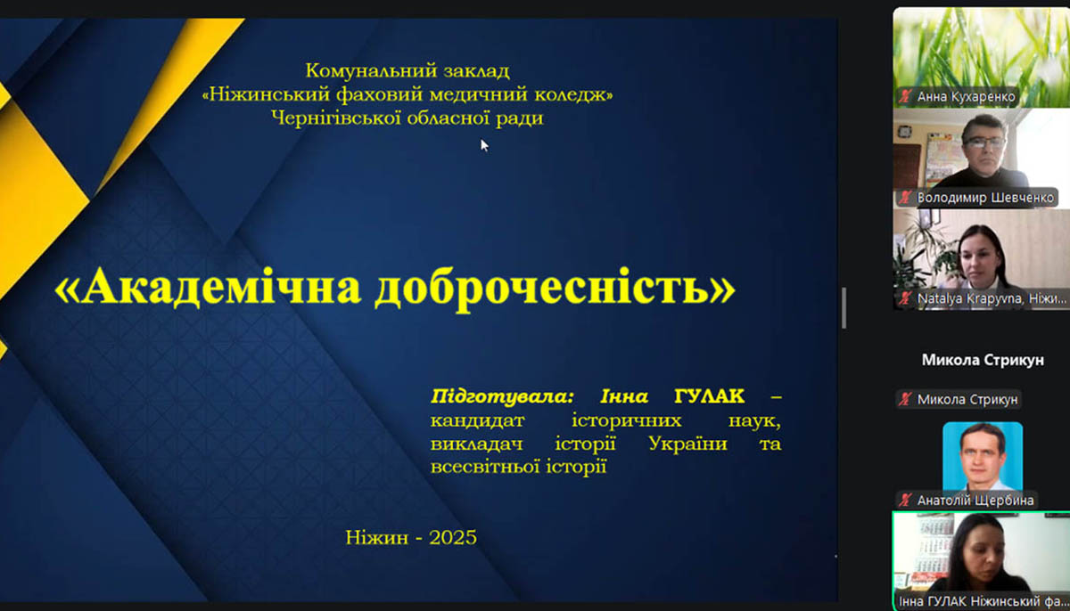 Інна Гулак, кандидат історичних наук, викладач Ніжинського фахового медичного коледжу, ознайомила з основними положеннями нового Закону України «Про академічну доброчесність», окреслила ключові зміни, що стосуються викладачів і здобувачів освіти.