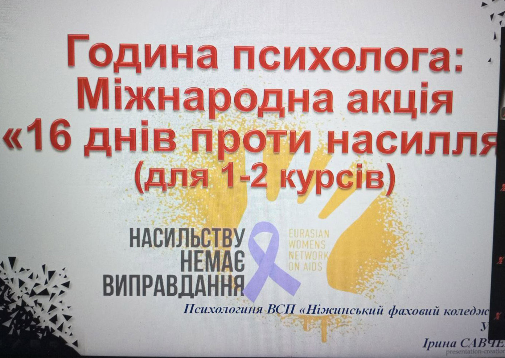 У рамках акції «16 днів проти насильства» практичним психологом Ніжинського фахового коледжу НУБіП України Іриною Савченко було проведено ряд заходів, спрямованих на протидію насильницькій поведінці. Зокрема, для студентів перших курсів спеціальності J8 Автомобільний транспорт групи ПН251 та спеціальності G7 Автоматизація, комп’ютерно-інтегровані технології та робототехніка групи АН251 були проведені години психолога щодо проявів домашнього насильства з переглядом відеороликів соціального характеру. Особлива увага приділялася питанням психологічної безпеки, формуванню навичок ненасильницької комунікації та вмінню розпізнавати небезпечні ситуації.